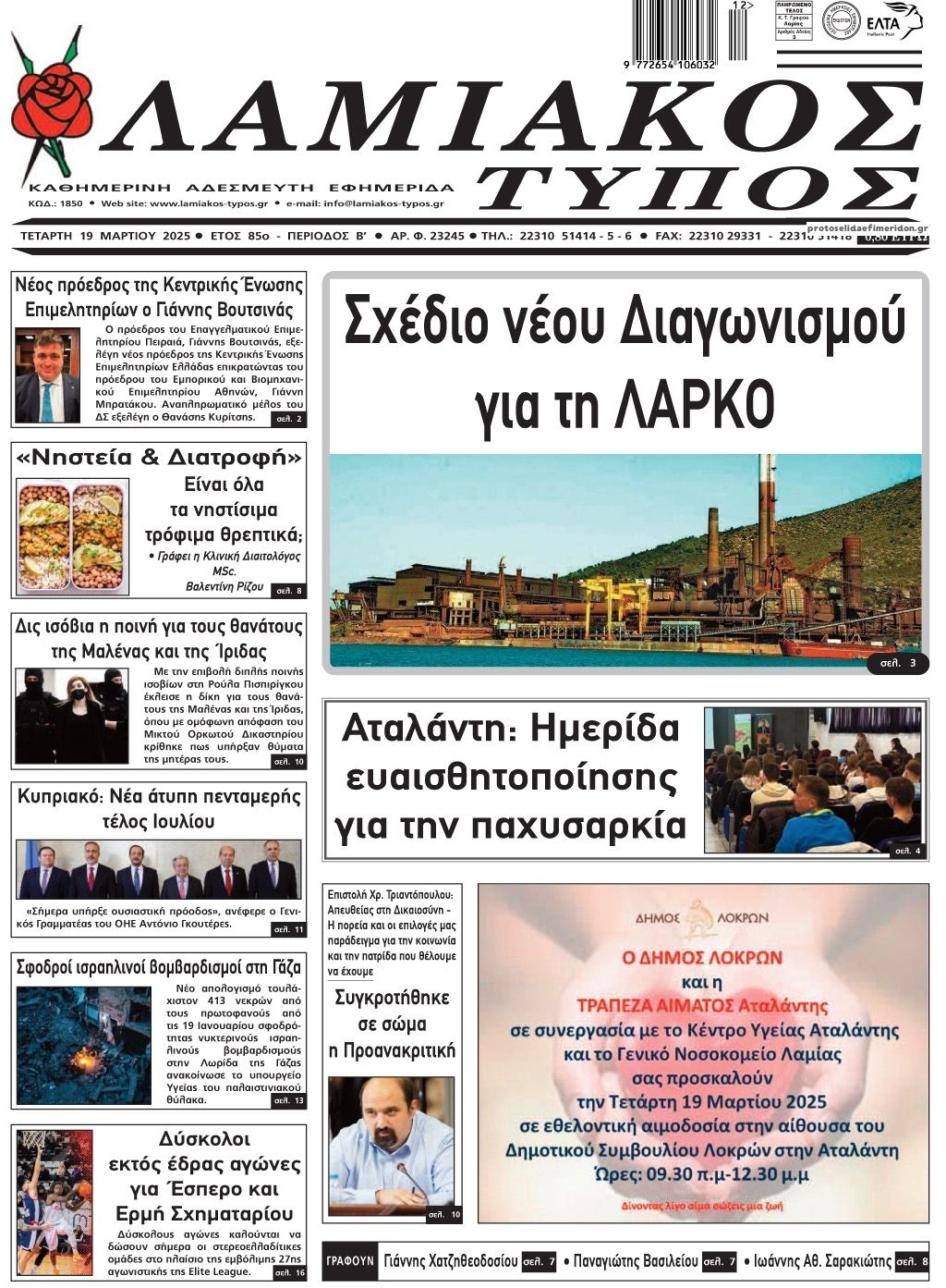 Διαβάστε το πρωτοσέλιδο της εφημερίδας Λαμιακός Τύπος