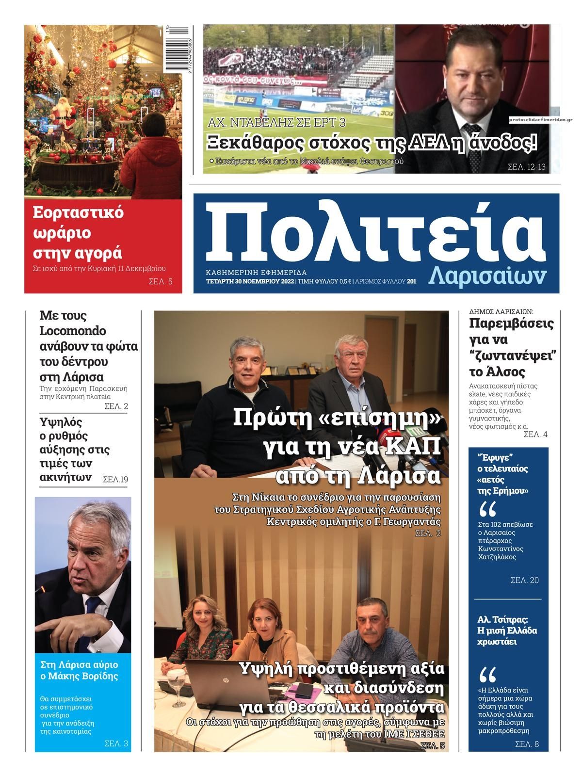 Διαβάστε το πρωτοσέλιδο της εφημερίδας Πολιτεία Λαρισαίων