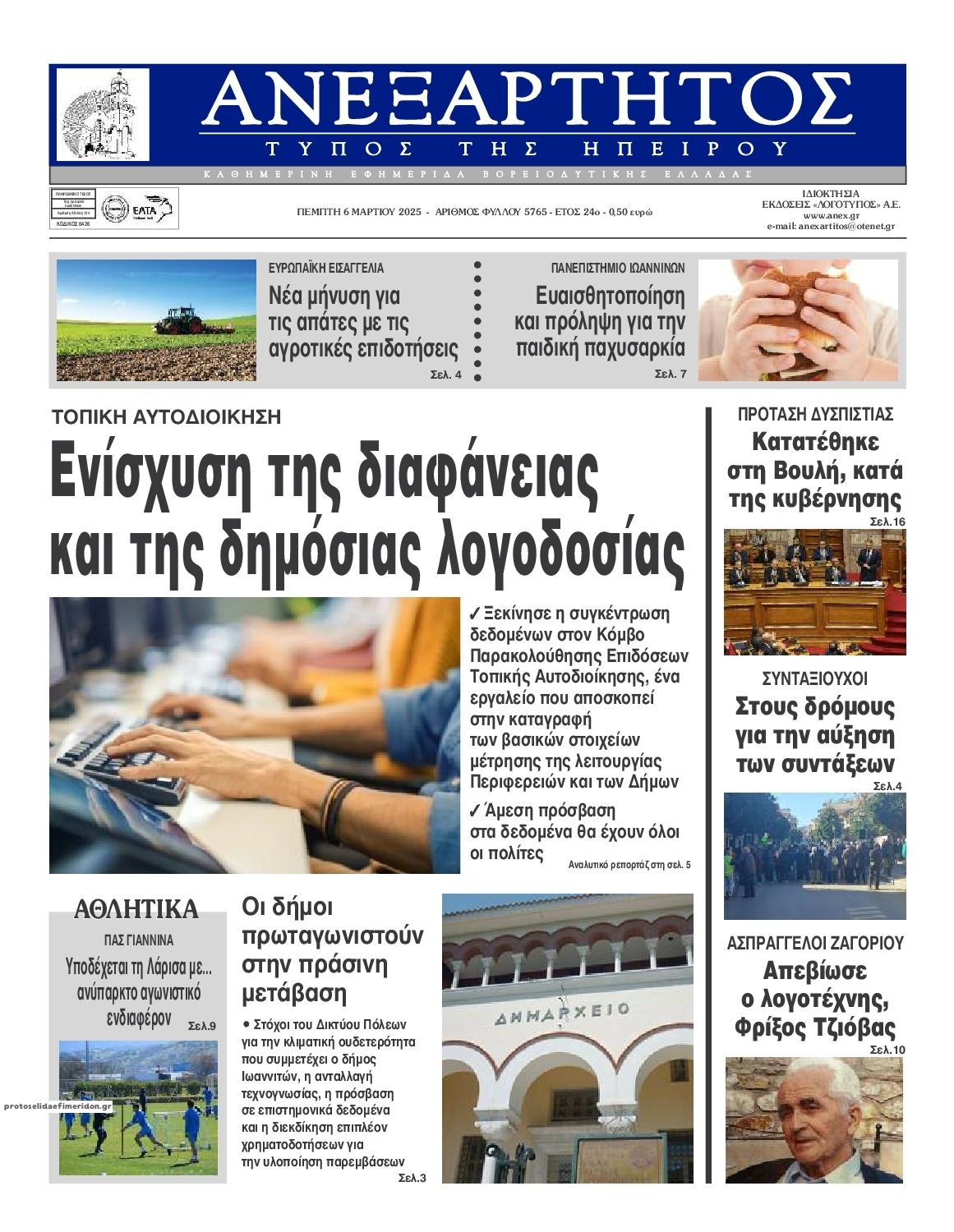 Διαβάστε το πρωτοσέλιδο της εφημερίδας Ανεξάρτητος Ηπείρου