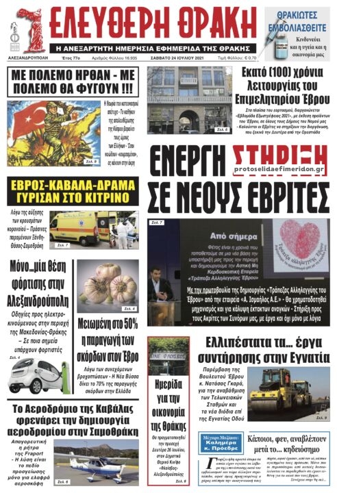 Σε αυτή τη σελίδα θα βρείτε το πρωτοσέλιδο της εφημερίδας Ελεύθερη Θράκη που κυκλοφόρησε Σάββατο 24 Ιουλίου 2021. Για να διαβάσετε το πρωτοσέλιδο της εφημερίδας Ελεύθερη Θράκη σε μεγαλύτερο μέγεθος κρατήστε το ποντίκι πατημένο πάνω στο μεγάλο πρωτοσέλιδο Ελεύθερη Θράκη και σύρετε προς την κατέυθυνση που θέλετε. Για να δείτε το ιστορικό αρχείο της εφημερίδας Ελεύθερη Θράκη πατήστε εδώ ή πατήστε από μενού "Αρχείο" και επιλέξτε από τη λίστα Ελεύθερη Θράκη.