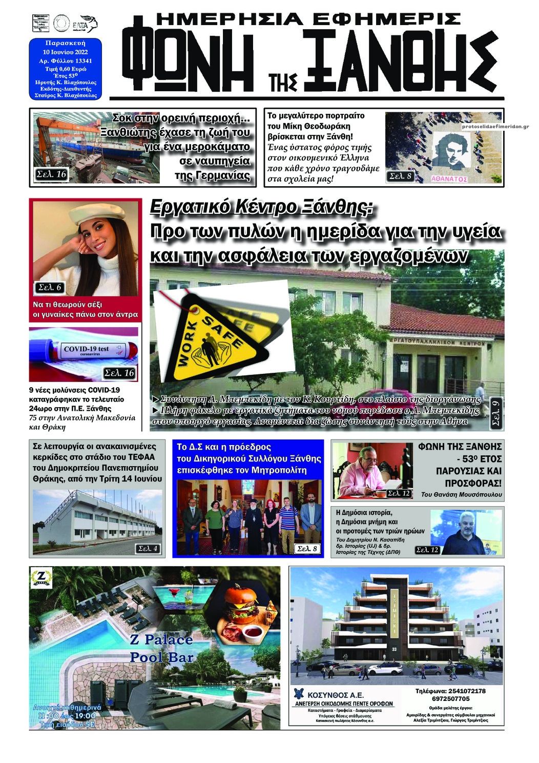Σε αυτή τη σελίδα θα βρείτε το πρωτοσέλιδο της εφημερίδας Φωνή της Ξάνθης που κυκλοφόρησε Παρασκευή 10 Ιουνίου 2022. Για να διαβάσετε το πρωτοσέλιδο της εφημερίδας Φωνή της Ξάνθης σε μεγαλύτερο μέγεθος κρατήστε το ποντίκι πατημένο πάνω στο μεγάλο πρωτοσέλιδο Φωνή της Ξάνθης και σύρετε προς την κατέυθυνση που θέλετε. Για να δείτε το ιστορικό αρχείο της εφημερίδας Φωνή της Ξάνθης πατήστε εδώ ή πατήστε από μενού "Αρχείο" και επιλέξτε από τη λίστα Φωνή της Ξάνθης.