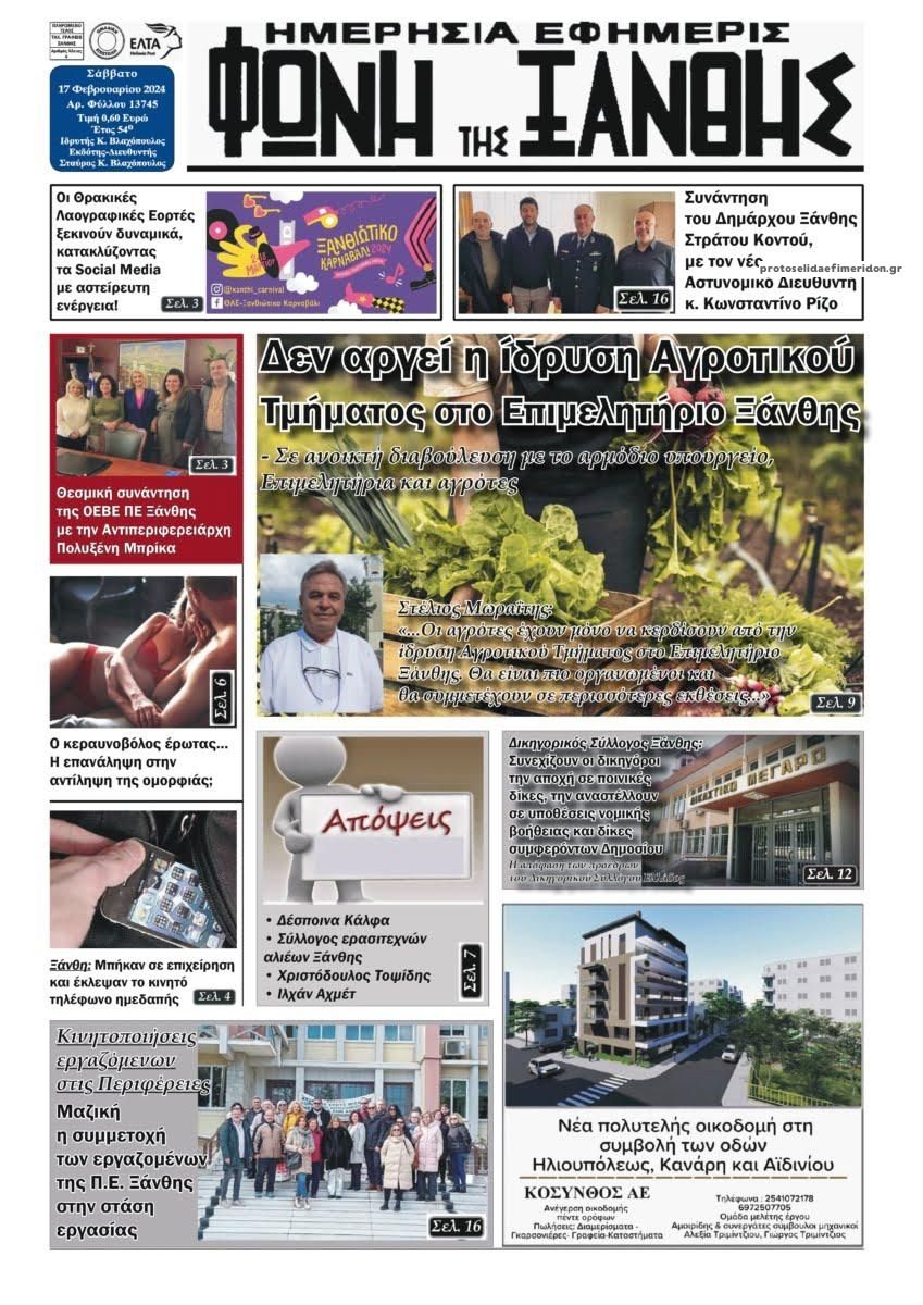 Διαβάστε το πρωτοσέλιδο της εφημερίδας Φωνή της Ξάνθης