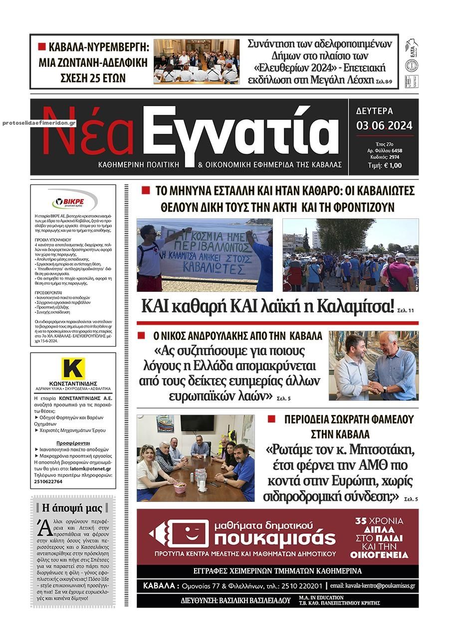 Διαβάστε το πρωτοσέλιδο της εφημερίδας Νέα Εγνατία