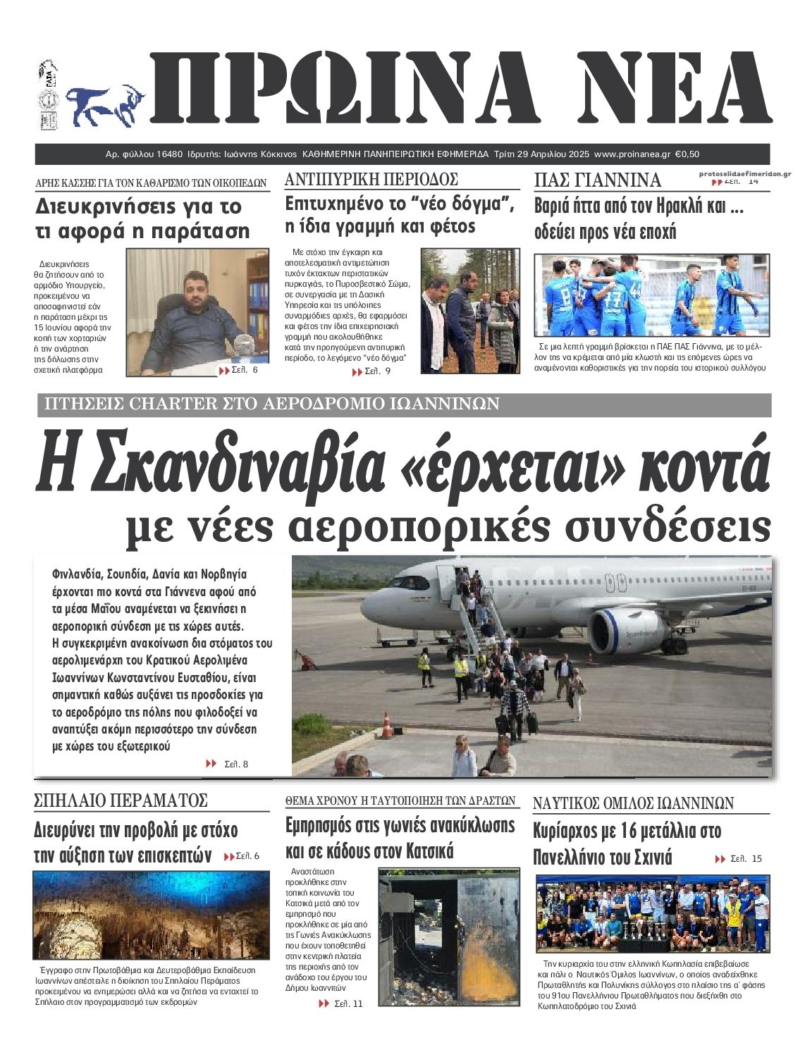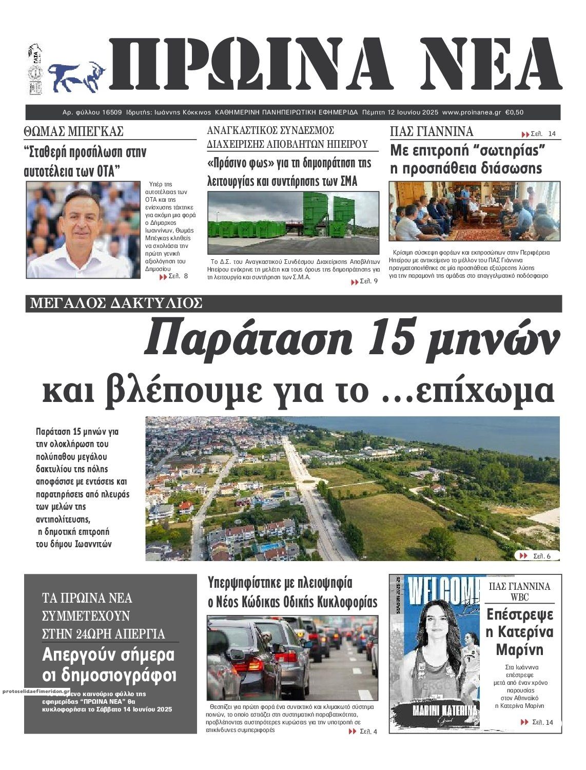 Διαβάστε το πρωτοσέλιδο της εφημερίδας Πρωινά Νέα Ιωαννίνων