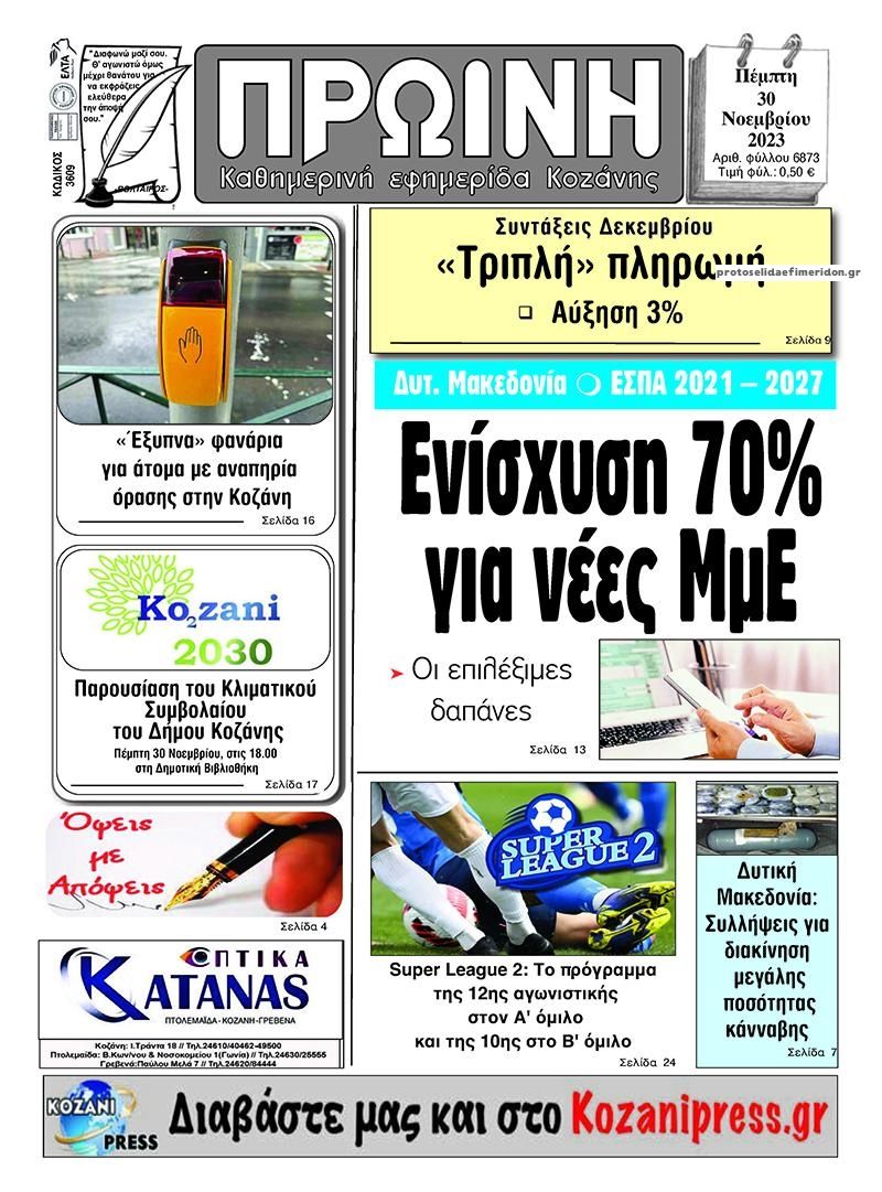 Διαβάστε το πρωτοσέλιδο της εφημερίδας Πρωινή Κοζάνης