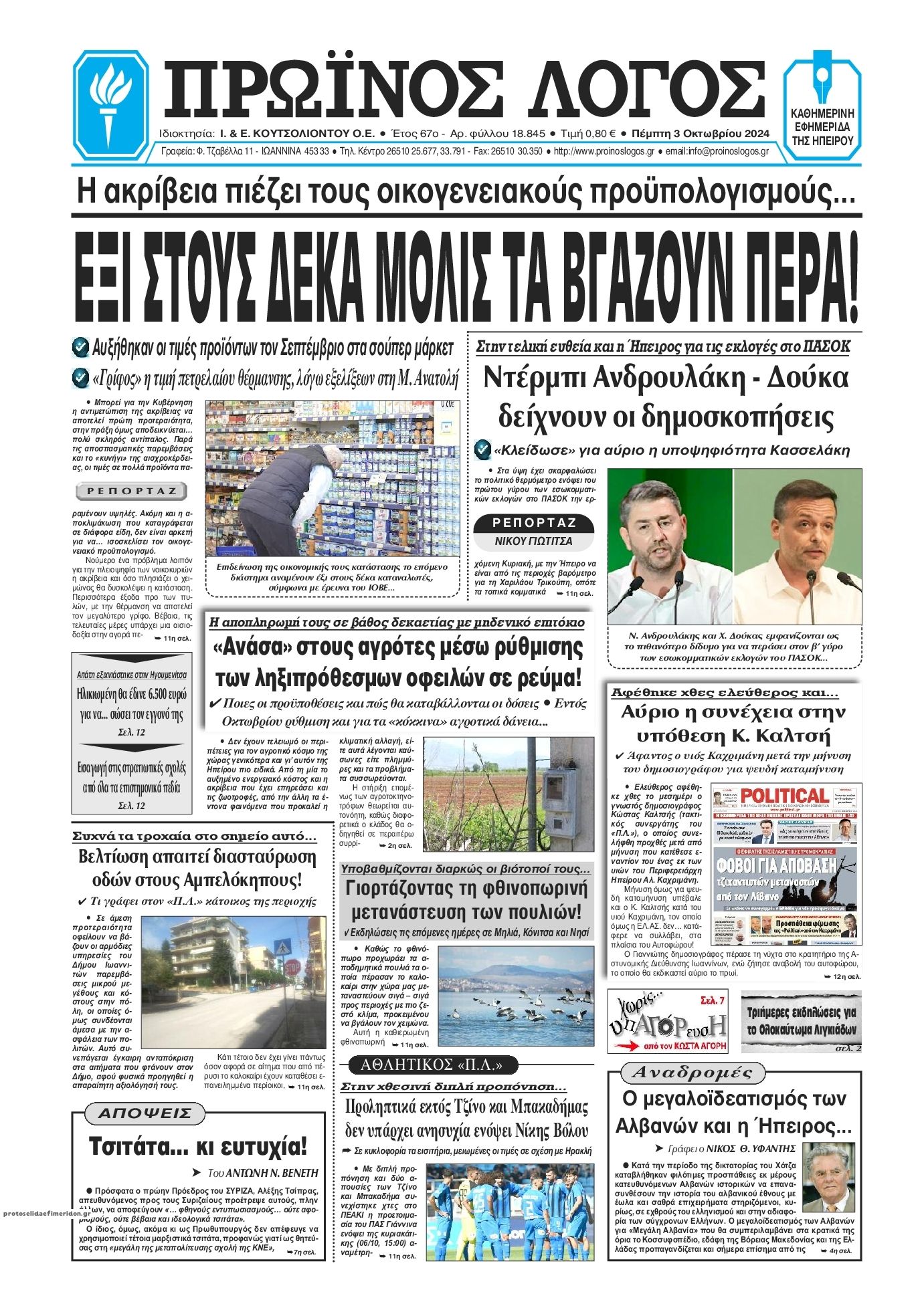 Διαβάστε το πρωτοσέλιδο της εφημερίδας Πρωινός λόγος Ιωαννίνων