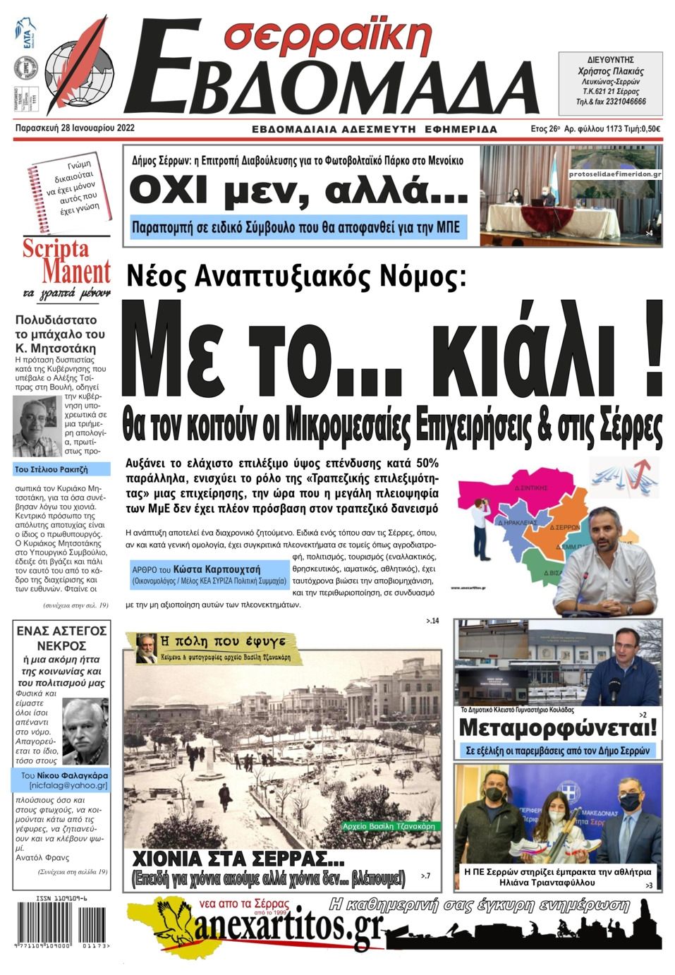 Διαβάστε το πρωτοσέλιδο της εφημερίδας Σερραϊκή Εβδομάδα