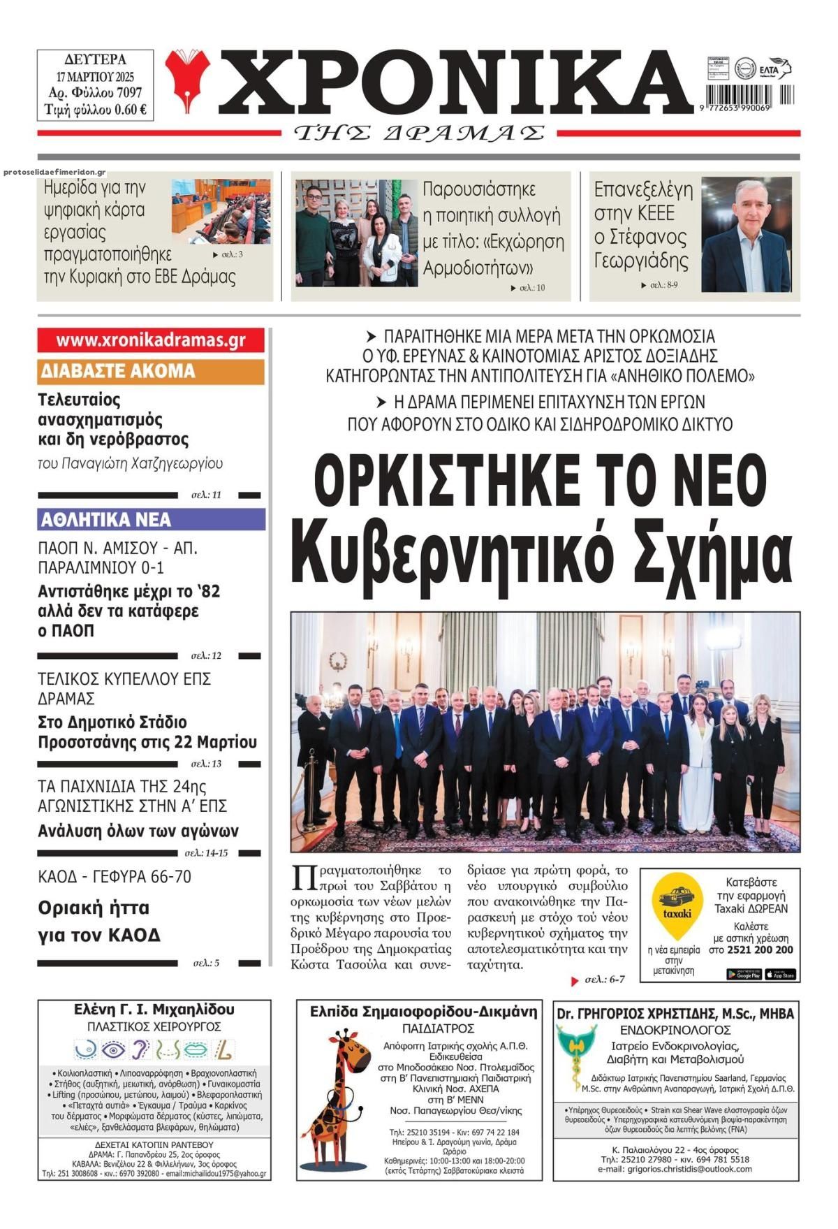 Διαβάστε το πρωτοσέλιδο της εφημερίδας Χρονικά Δράμας