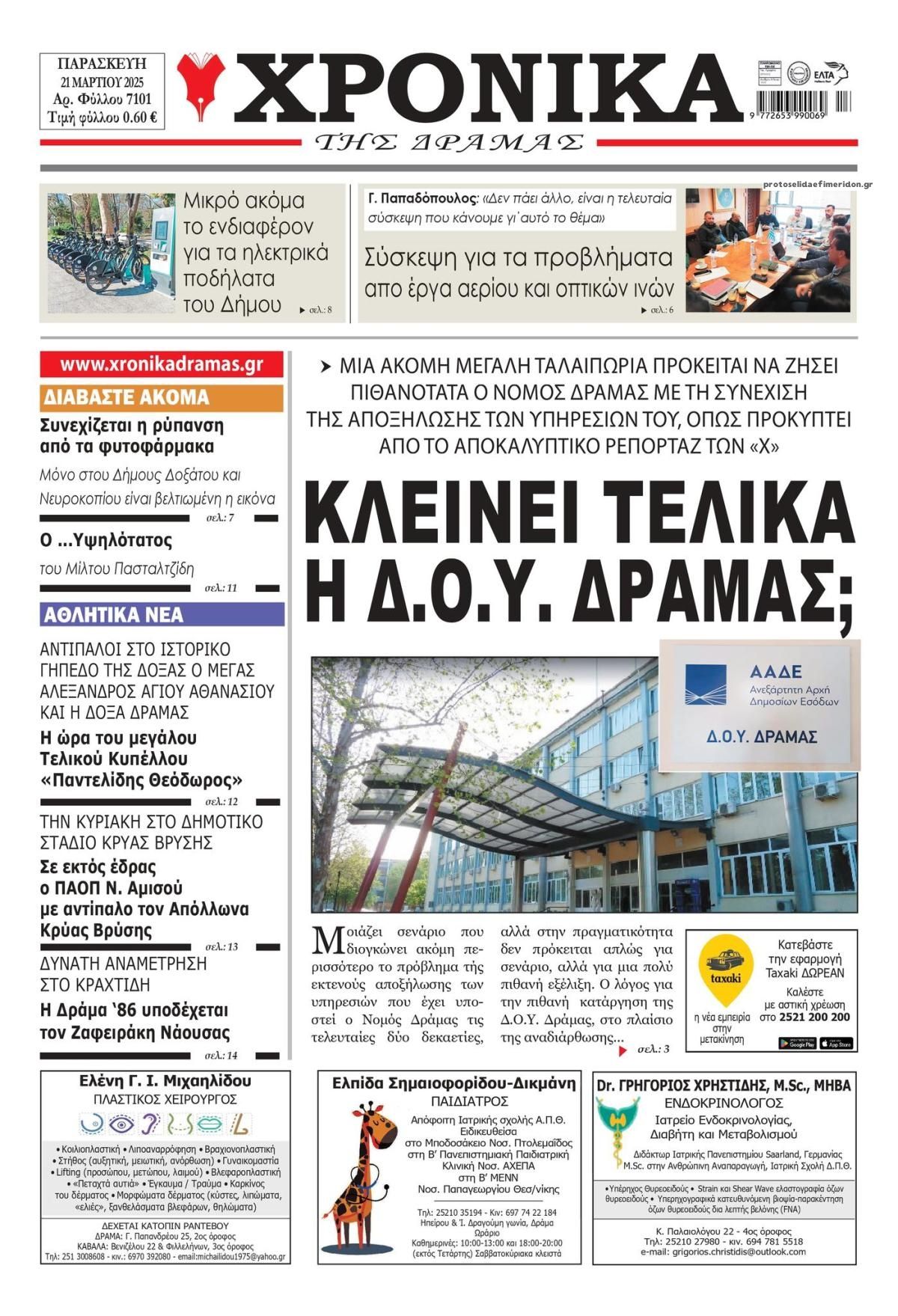Διαβάστε το πρωτοσέλιδο της εφημερίδας Χρονικά Δράμας