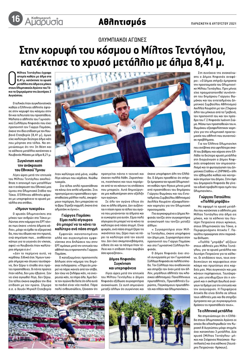Σε αυτή τη σελίδα θα βρείτε το πρωτοσέλιδο της εφημερίδας Αμαρυσία που κυκλοφόρησε Παρασκευή 6 Αυγούστου 2021. Για να διαβάσετε το πρωτοσέλιδο της εφημερίδας Αμαρυσία σε μεγαλύτερο μέγεθος κρατήστε το ποντίκι πατημένο πάνω στο μεγάλο πρωτοσέλιδο Αμαρυσία και σύρετε προς την κατέυθυνση που θέλετε. Για να δείτε το ιστορικό αρχείο της εφημερίδας Αμαρυσία πατήστε εδώ ή πατήστε από μενού "Αρχείο" και επιλέξτε από τη λίστα Αμαρυσία.