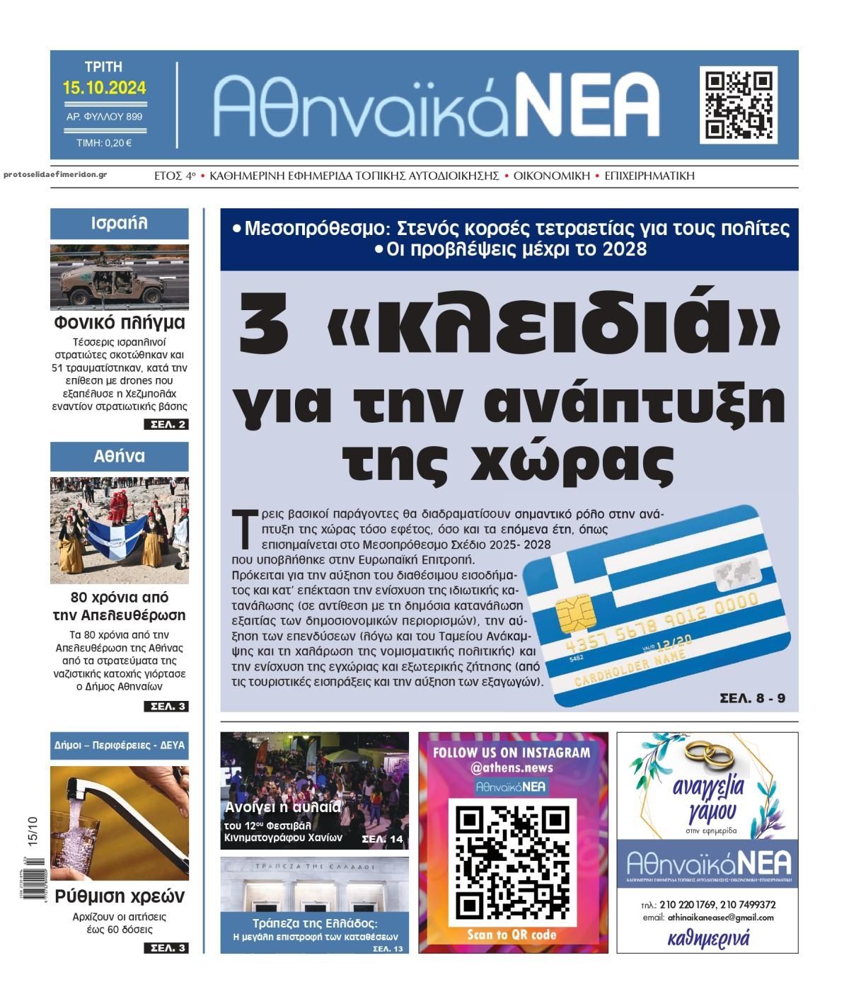 Διαβάστε το πρωτοσέλιδο της εφημερίδας Αθηναϊκά Νέα
