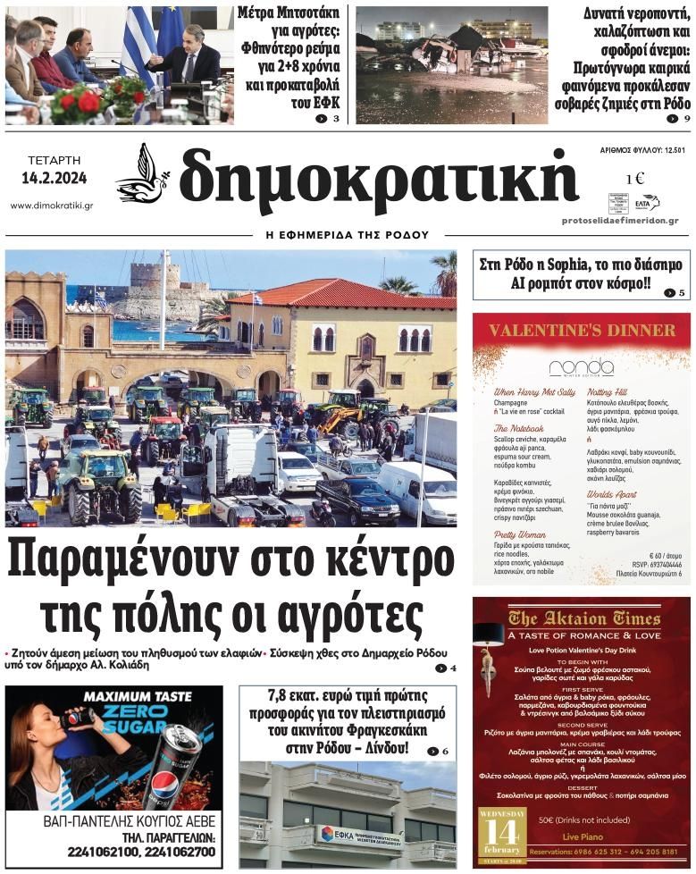 Διαβάστε το πρωτοσέλιδο της εφημερίδας Δημοκρατική