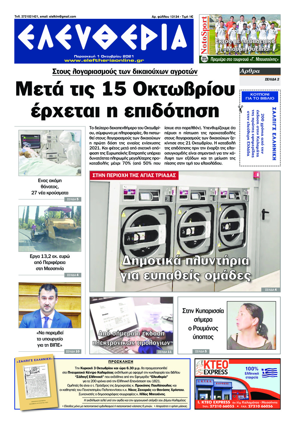 Διαβάστε το πρωτοσέλιδο της εφημερίδας Ελευθερία Καλαμάτας