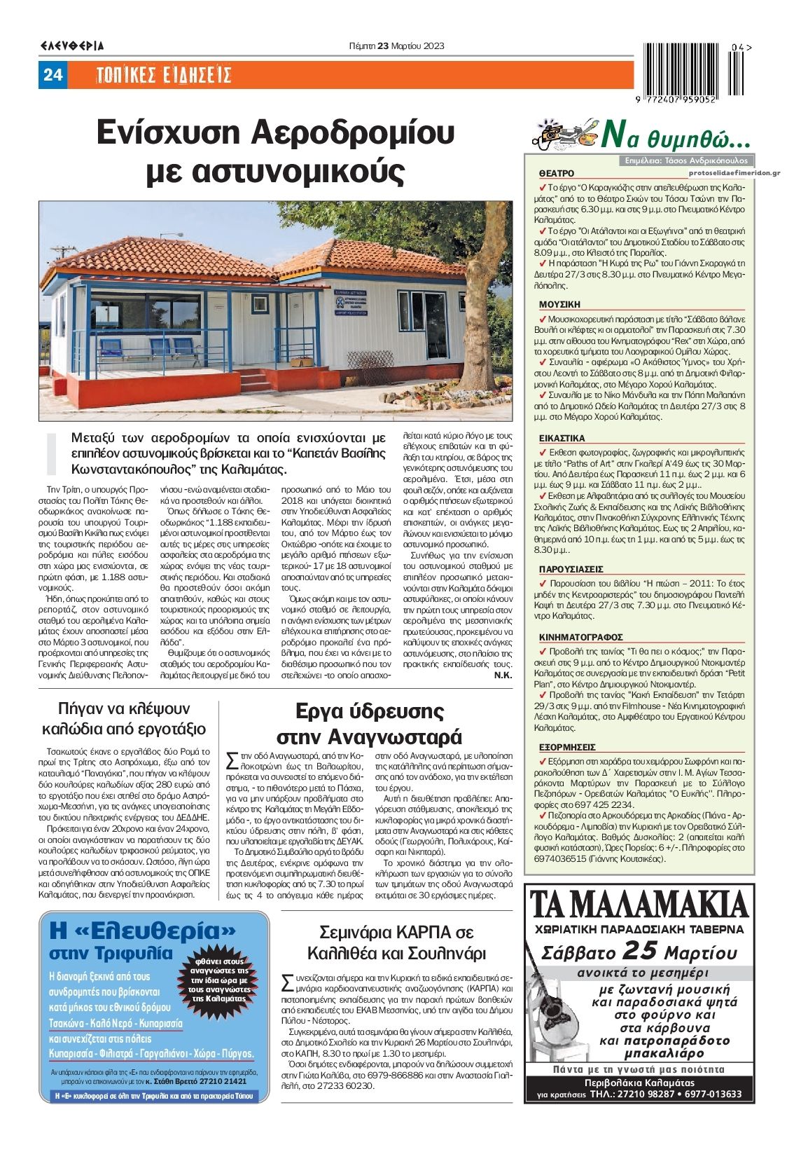 Διαβάστε το πρωτοσέλιδο της εφημερίδας Ελευθερία Καλαμάτας