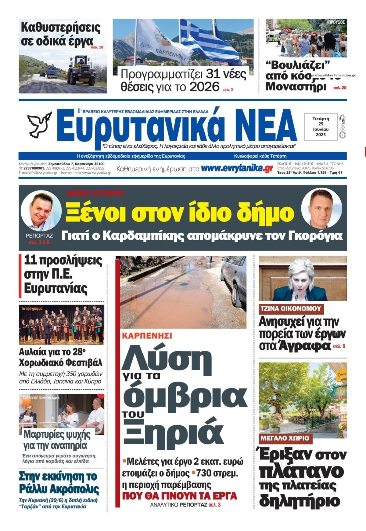 Διαβάστε το πρωτοσέλιδο της εφημερίδας Ευρυτανικά Νέα