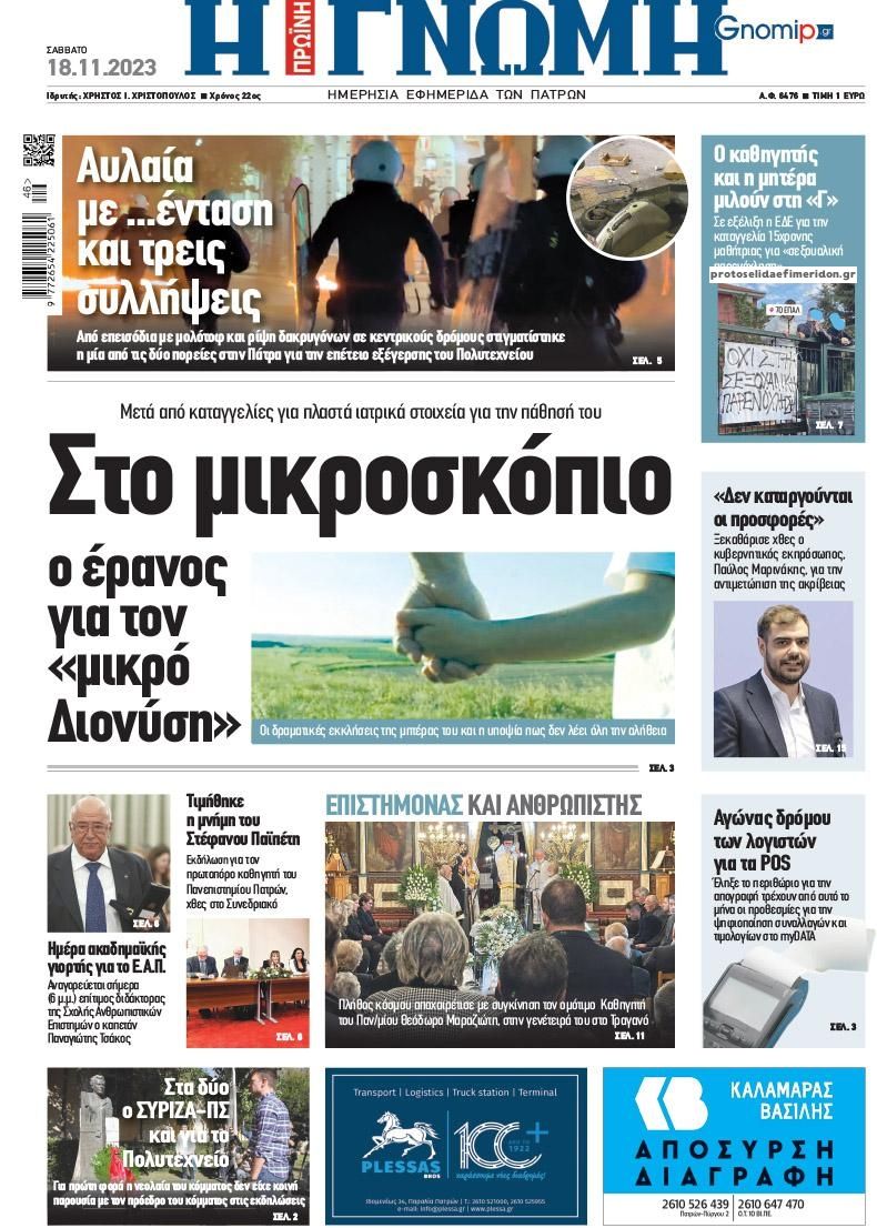 Διαβάστε το πρωτοσέλιδο της εφημερίδας Γνώμη της Πάτρας