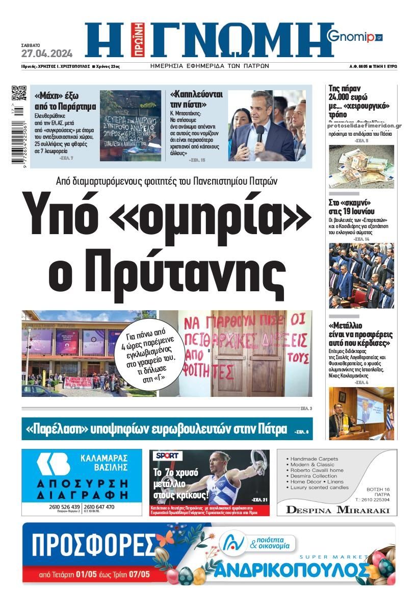 Διαβάστε το πρωτοσέλιδο της εφημερίδας Γνώμη της Πάτρας