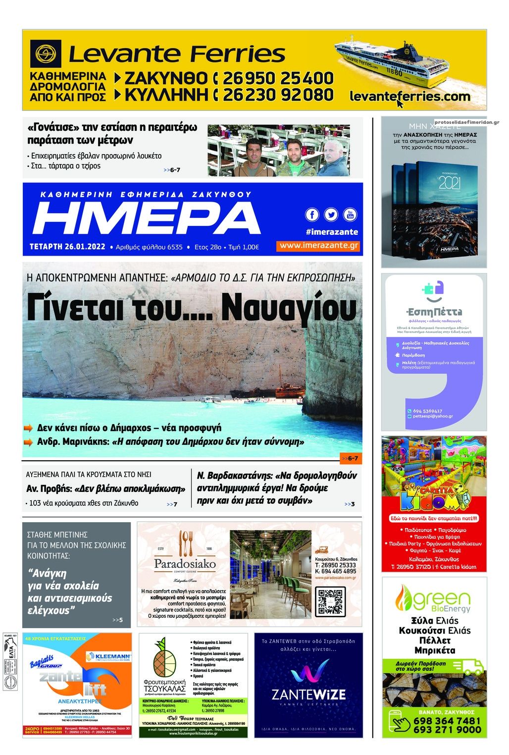 Διαβάστε το πρωτοσέλιδο της εφημερίδας Ημέρα Ζακύνθου