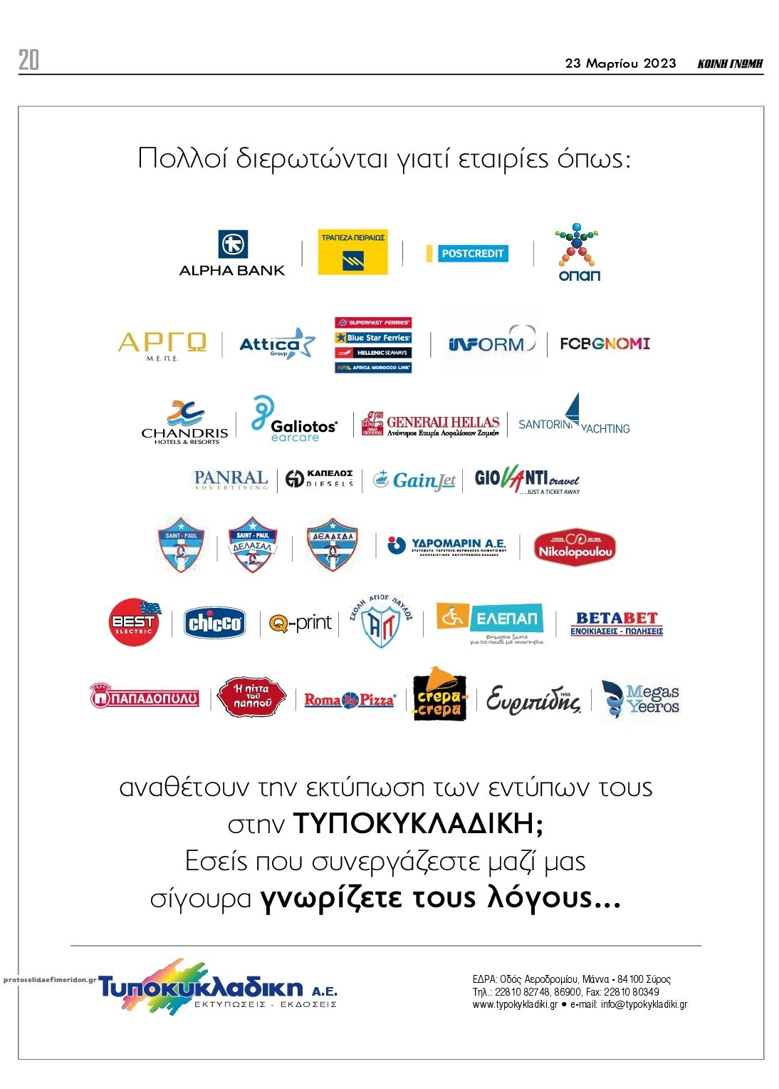 Διαβάστε το πρωτοσέλιδο της εφημερίδας Κοινή Γνώμη Κυκλάδων
