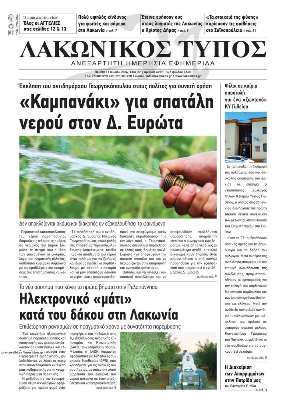 Διαβάστε το πρωτοσέλιδο της εφημερίδας Λακωνικός Τύπος