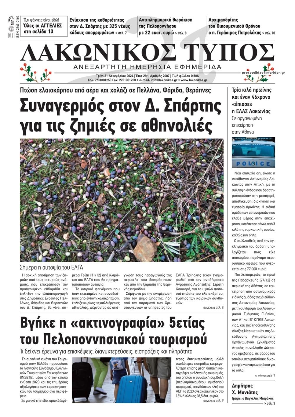 Διαβάστε το πρωτοσέλιδο της εφημερίδας Λακωνικός Τύπος