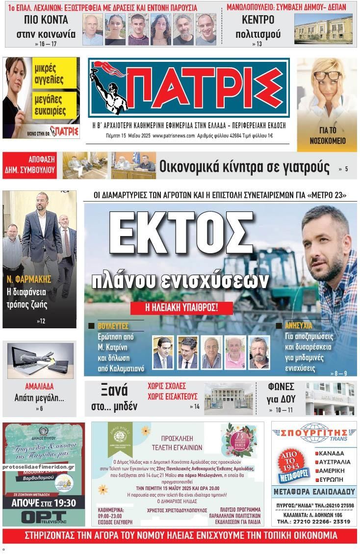 Διαβάστε το πρωτοσέλιδο της εφημερίδας Πατρις Ηλείας