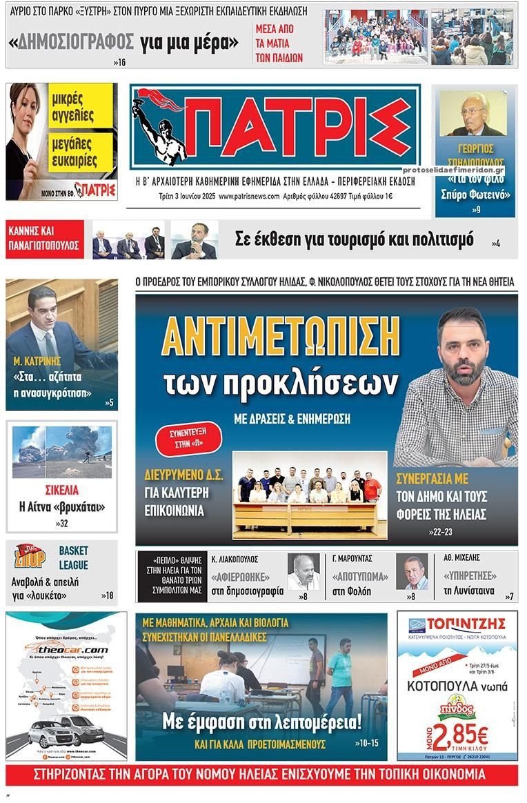 Διαβάστε το πρωτοσέλιδο της εφημερίδας Πατρις Ηλείας