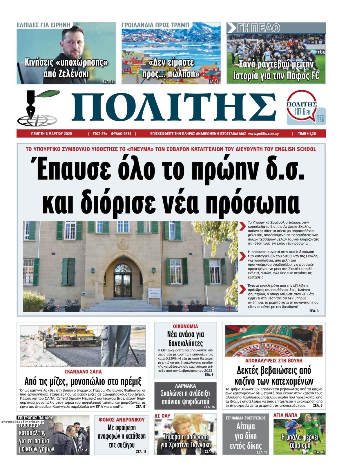 Διαβάστε το πρωτοσέλιδο της εφημερίδας Πολίτης Κύπρου