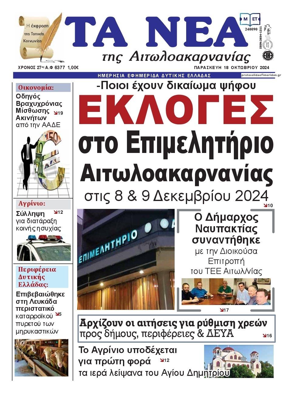 Διαβάστε το πρωτοσέλιδο της εφημερίδας Τα Νέα Αιτωλοακαρνανίας